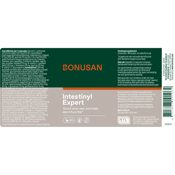 - Gecertificeerd voor voedselveiligheid: Bonusan werkt volgens FSSC-gecertificeerde normen voor maximale veiligheid en betrouwbaarheid.Wat doet Bonusan Intestinyl Expert?