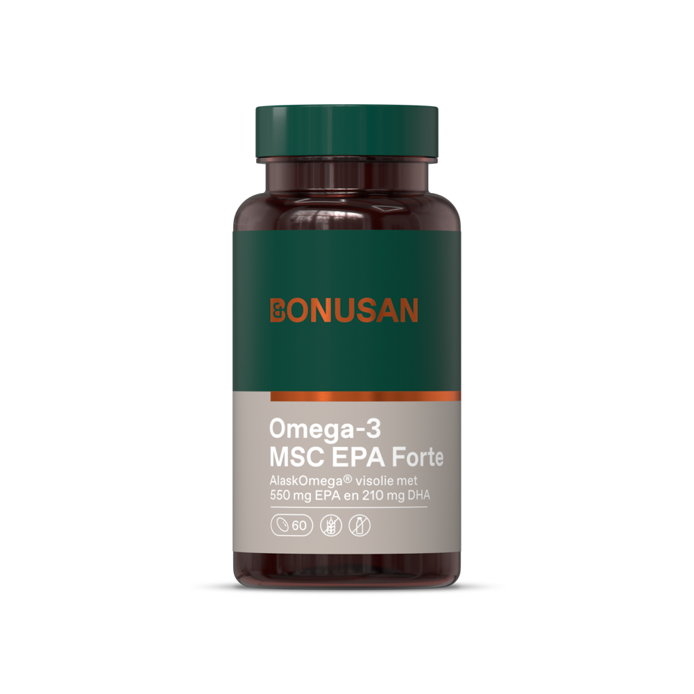 Bonusan Omega-3 MSC EPA Forte bevat extra EPA. Omega-3-vetzuren, waarvan EPA deel uitmaakt, zijn een groep met meervoudig onverzadigde vetzuren en belangrijke bouwstoffen voor het menselijk lichaam. EPA halen we uit onze voeding, vooral uit vette vis. Soms lukt het niet om voldoende EPA-rijke voeding te eten, heeft ons lichaam moeite om EPA uit de andere omega-3-vetzuren om te zetten of eten we te veel omega-6, waardoor de balans omega-3 en omega- 6 uit verhouding is. Het kan dan fijn zijn om extra EPA in te nemen.Bonusan maakt voor haar omega-3-supplementen gebruik van gezuiverde en gefilterde visolie. Voor dit product gebruiken we alleen de natuurlijke triglyceridenvorm van omega-3. In tegenstelling tot kunstmatige ethylesters, zijn visvetzuren in triglyceridenvorm precies zoals de natuur het aanbiedt.